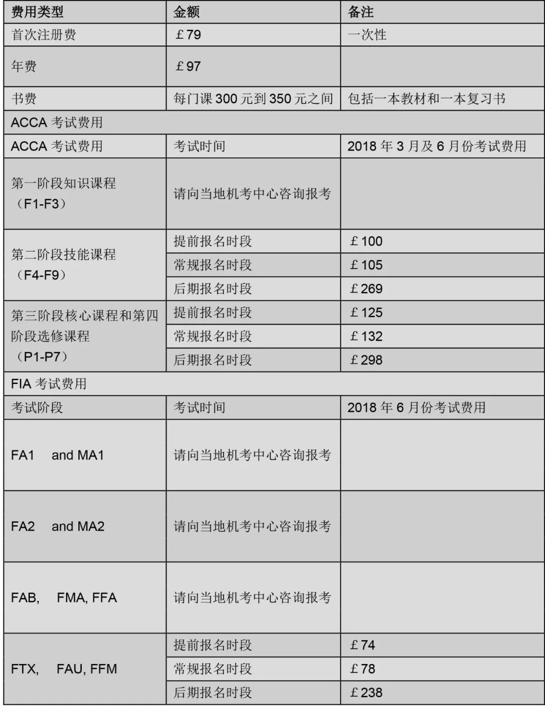 > ACCA考试费用 | 2018年